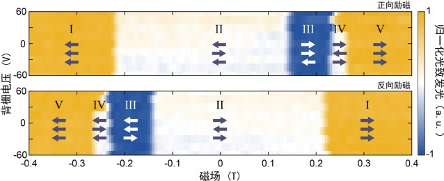 图1 | a. 本征三层CrSBr示意图、磁态的中心反演对称性及SHG磁滞回信号。b. 三层CrSBr器件示意图、磁态的中心反演对称性破缺及SHG磁滞回曲线。图中i代表中心反演操作。 这一由层间电荷转移主导的交换相互作用机制,使研究团队能够更进一步通过背栅电压调控CrSBr中的电子掺杂浓度,从而成功实现了对三层CrSBr磁态演化过程的调控(Fig. 2)。在零栅压或负栅压条件下,三层CrSBr的磁态演化依次经历了混合态(III)、反铁磁态(IV),最终翻转为铁磁态(V)。而当施加正栅压(如60 V)后,额外的电子掺杂进一步削弱了顶部两层CrSBr间的反铁磁交换相互作用,由此实现了由混合态(III)直接翻转为铁磁态(V)的演化路径。 该实验研究成果表明,层间电荷转移不仅能够构造二维磁结构的对称性破缺,还能诱导简并磁多态的形成。这些磁多态能够通过SHG实现有效分辨,并通过电学调控改变磁态演化路径。该工作为基于二维磁性材料的多态信息存储与计算架构设计提供了重要思路,并为自旋电子学与光自旋电子学等领域的后续研究奠定了基础。