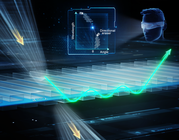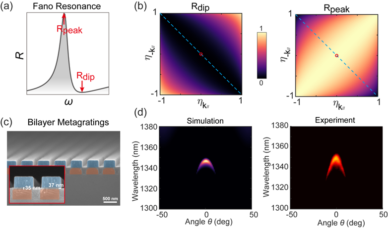 近日,复旦大学物理学系/应用表面物理全国重点实验室周磊教授团队联合中山大学物理学院/光电材料与技术全国重点实验室董建文教授提出了调控Fano共振光谱的辐射单向性新自由度,基于双层错位超构光栅克服了周期体系内禀的角度-波长锁定机制。团队发展了双层微纳光栅制备工艺和辐射单向性的显微角分辨测量技术,并在实验上首次展示了具有“空间频率-光谱频率”联合选择性的高对比度成像。相关研究成果以 “Overcoming intrinsic dispersion locking for achieving spatio-spectral selectivity with misaligned bilayer metagratings” 为题发表于eLight期刊。复旦大学物理学系博士后庄泽鹏和中山大学物理学院研究生周鑫、曾浩龙为该论文的共同第一作者。     图1.基于双层超构光栅的光学辐射单向性按需精确抑制反射,实现单一波长和单一角度的光谱选择性 长期以来,由于周期体系具有内禀的色散特性,共振光谱中角度和波长存在锁定关系。因此,在人们的传统认知里,光入射角度改变伴随光学器件滤波波长改变是普遍的物理规律。这种锁定关系使得独立操控角度和波长成为难题,也为光学应用设置了基础性限制。